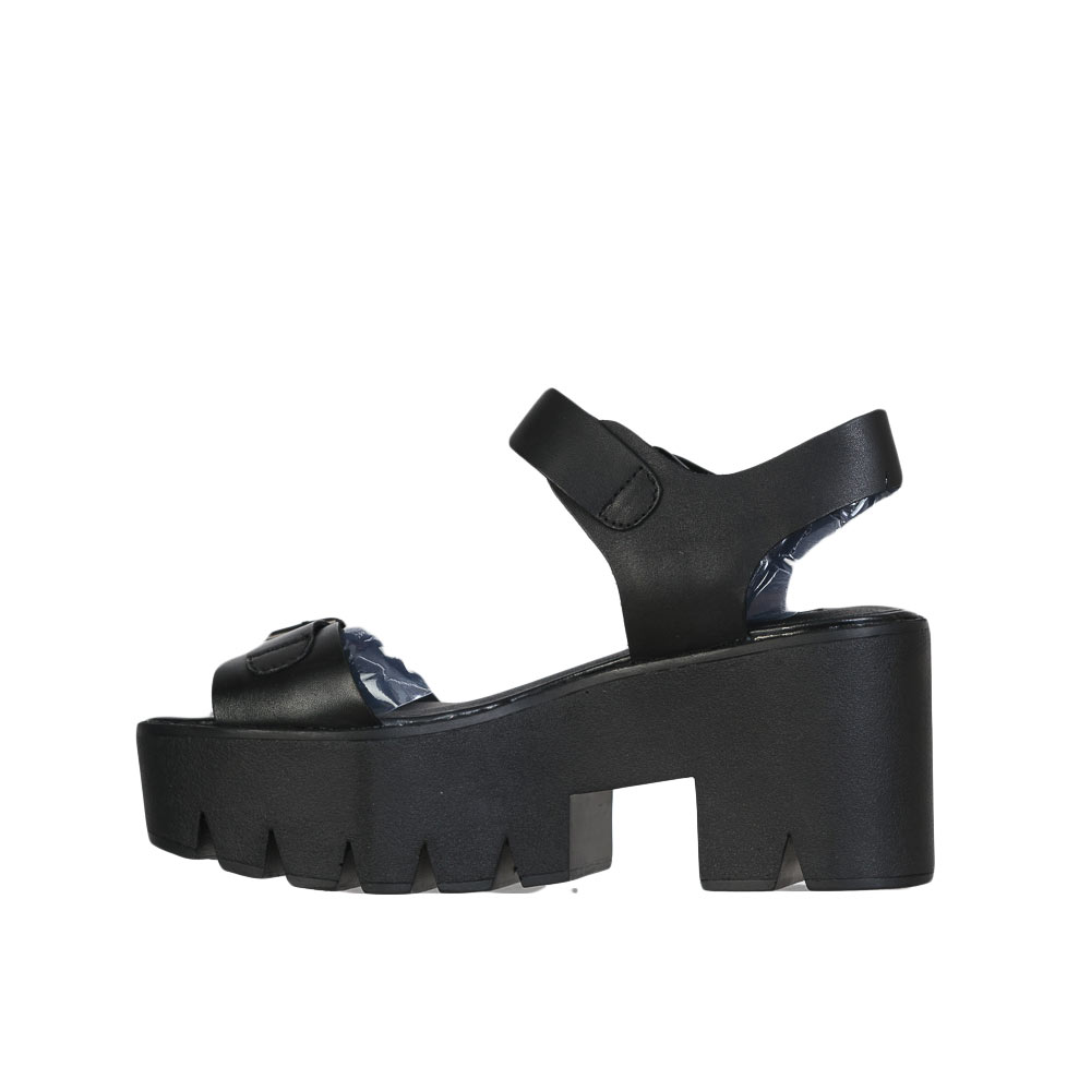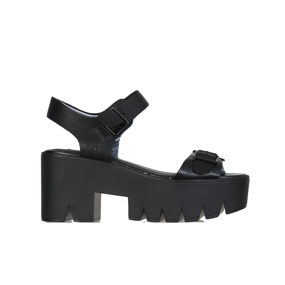 Sandalo in pelle nera. Altezza tacco 8cm, platform 4,5 cm. Fibbia regolabile sia sulla fascia che alla caviglia.