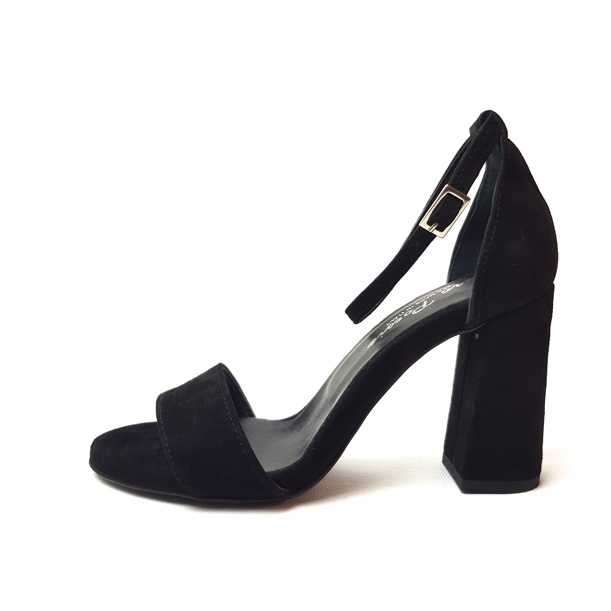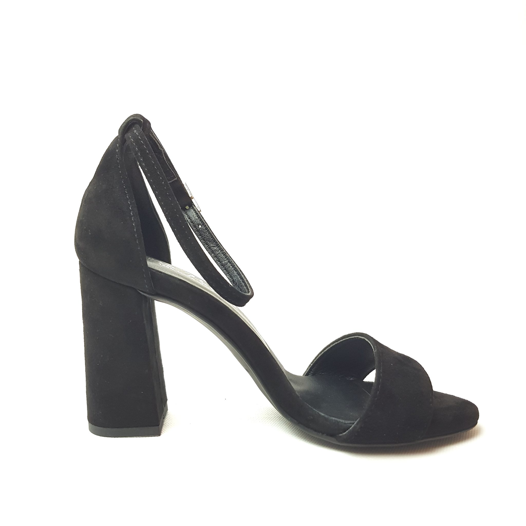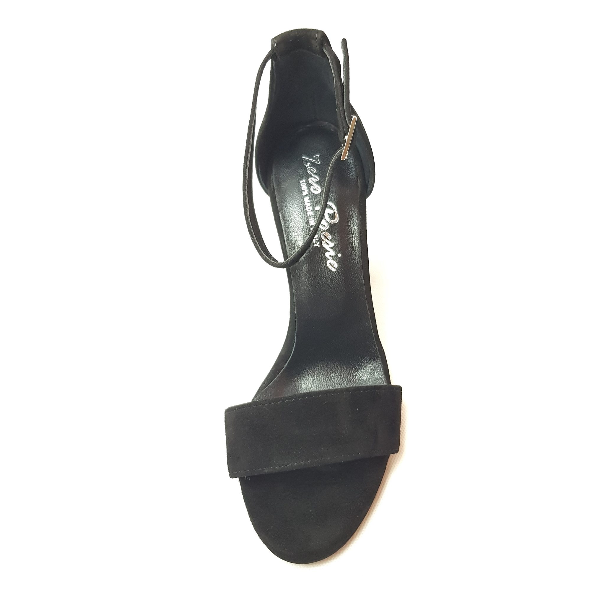Zero Poesie sandalo in suede nero con tallone chiuso. Allacciatura regolabile. Tacco 9 cm Fondo gomma. Made in Italy.